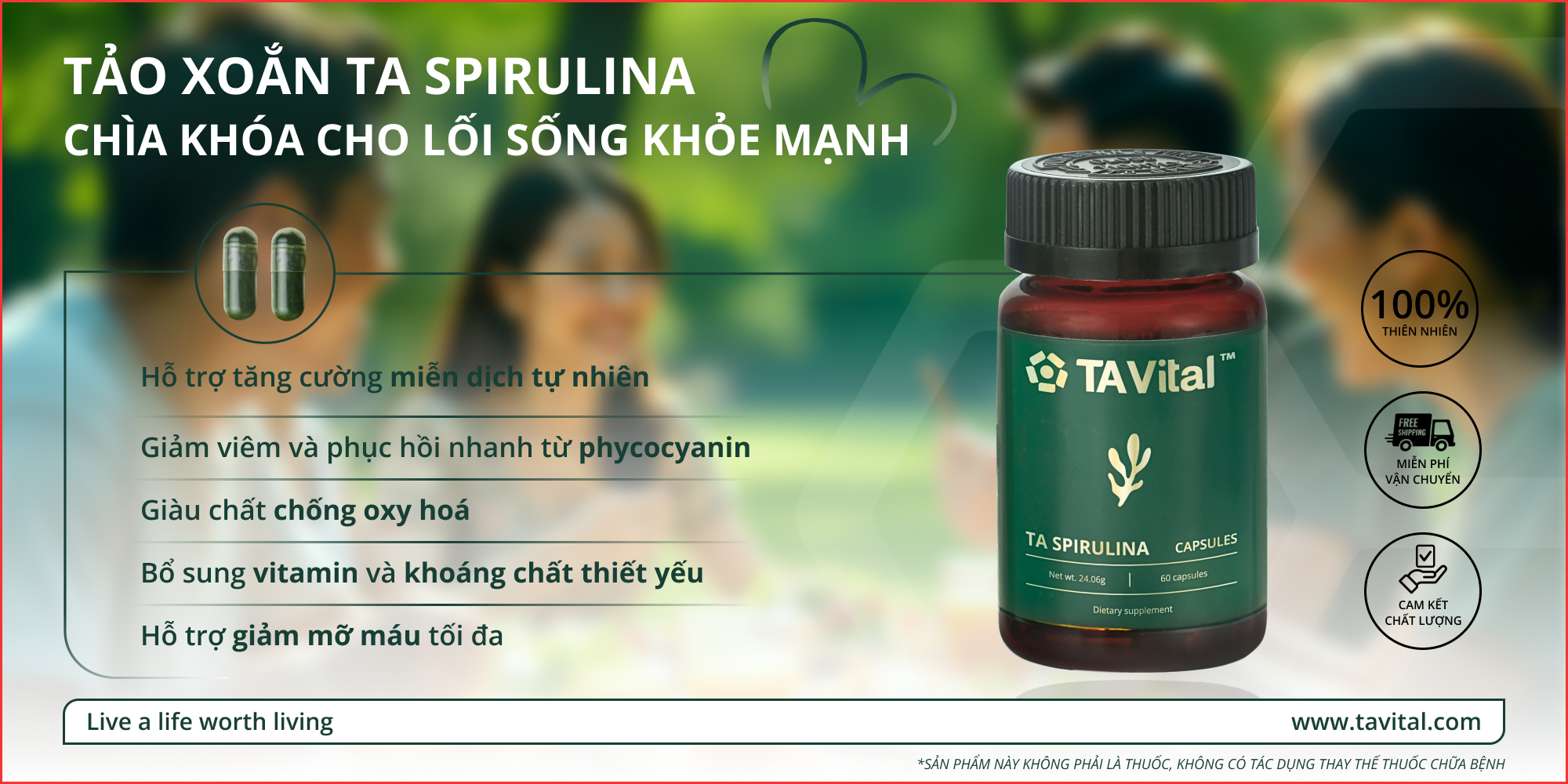 Bạn có thể chọn sản phẩm của TA Vital là dạng viên nang tiện lợi, dễ dàng kết hợp với nước, sinh tố hay các món uống hàng ngày với thành phần của mỗi viên chứa 325mg 100% bột tảo xoắn nguyên chất.